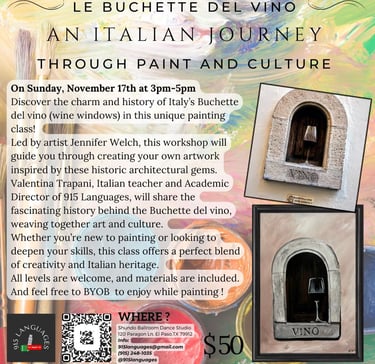 Discover the charm and history of Italy’s "buchette del vino" (wine windows) in this unique painting class! Led by Jennifer Welch, this workshop will guide you through creating your own artwork inspired by these historic architectural gems. Valentina Trapani, Italian teacher and academic director of 915 Languages, will share the fascinating history behind the buchette del vino, weaving together art and culture. This class offers a perfect blend of creativity and Italian heritage. All levels are welcome, and materials are included. BYOB