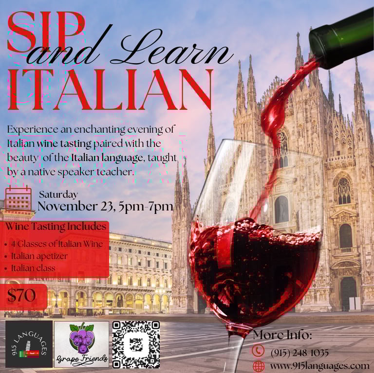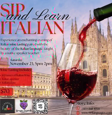 After a long wait, the event you’ve been asking for is finally coming back—and this time, in a brand-new location! Join us for an enchanting evening of Italian wine tasting paired with the beauty of the Italian language, taught by Valentina Trapani, at Grape Friends, a cozy wine bar that brings the perfect ambiance for this cultural experience. Let each sip transport you to the rolling vineyards, while every phrase invites you deeper into Italy’s soul. Salute !